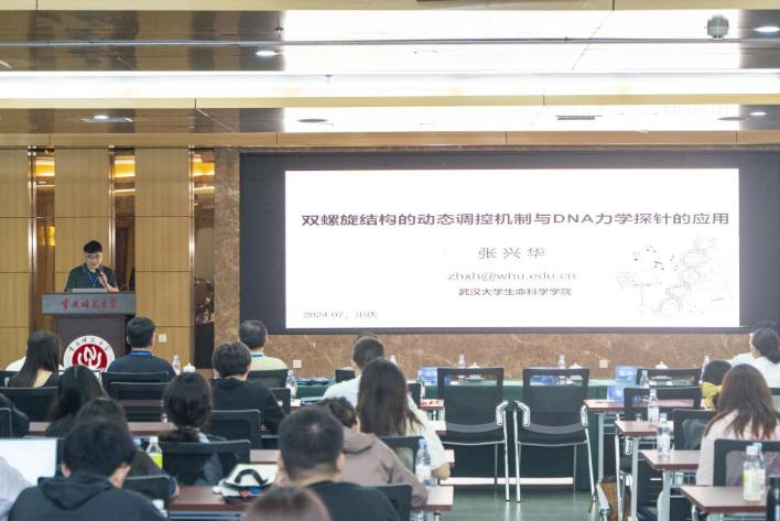 武汉大学张兴华教授作题为《DNA和RNA双螺旋结构的动态调控》的报告,介绍了如何使用单分子磁镊技术和单分子FRET技术去揭示RNA、DNA、蛋白质等生物大分子的动态结构及其相互作用,发现不同的离子结合方式是高价阳离子对DNA和RNA产生相反影响的原因,并通过结构生物信息学方法可以探索生物大分子的结构动态和功能机制。最后,张兴华教授还介绍了所在课题组发展了DNA力学探针,可用于临床场景的分子检测和单分子细胞力学检测。