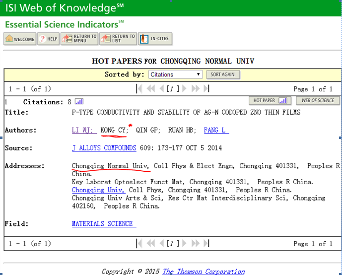 为第一单位于2014年发表在《JOURNALOF ALLOYS AND COMPOUNDS》上的学术论文《P TYPECONDUCTIVITY AND STABILITY OF AG-N CODOPED ZNO THIN FILMS》入选ESI热点论文(ESIHot Papers),标志斗牛游戏
