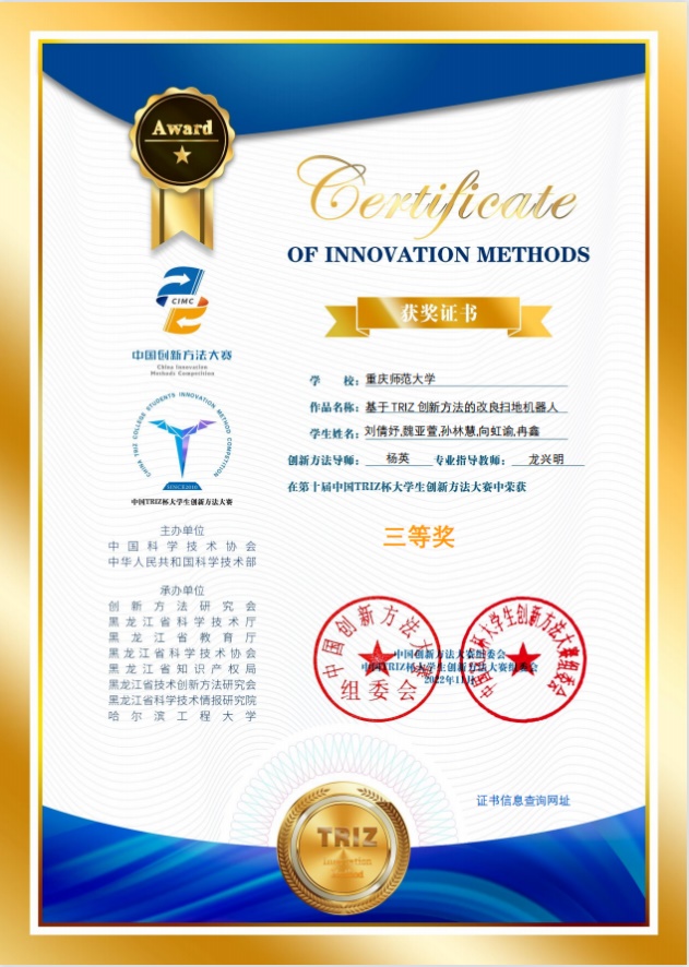 学生刘倩妤、杨宸杰等两个团队获得重庆市一等奖(晋级国家级比赛);冯秀亮、王康宇、任柏年、黄静怡等四个团队获二等奖;赵之瑞、陈桂馨、张佳雯、王莹莹、吴雨航、洪敏等六个团队获三等奖;学校被授予“重庆市triz创新方法比赛优秀组织单位”,杨英和龙兴明两位老师被评为重庆市级比赛优秀指导教师。晋级参与国家级比赛的两支参赛队伍,均获得三等奖,学校被科技部授予“第十届中国triz大学生创新方法大赛”优秀组织单位;杨英老师被评为“第十届中国triz大学生创新方法大赛”优秀联络员。