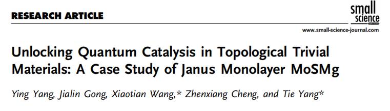 杨英教授关于拓扑催化材料的研究工作以重庆师范大学为第一单位在《Small Science》上发表题为“Unlocking Quantum Catalysis in Topological Trivial Materials: A Case Study of Janus Monolayer MoSMg”的最新研究成果。《Small Science》是WILEY在2021年最新推出的纳米领域开放获取顶尖旗舰期刊,最新影响因子为11.1。《Small Science》旨在成为大科学时代国际高质量的跨学科科研技术交流平台,致力于报道来自纳米科学和纳米技术各个领域最具影响力的研究成果。