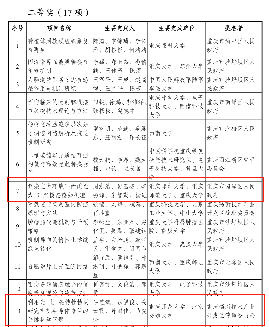 近日,2024年度重庆市科学技术奖获奖名单公布,物理与电子工程学院牛连斌教授牵头、北京交通大学参与的《利用光—电—磁特性协同研究有机半导体器件的关键科学问题》项目和毋玉芬老师作为第二完成人参与的《复杂应力环境下的柔性力-声双模态感知机理》项目,双双荣获“2024年度重庆市自然科学奖二等奖”。