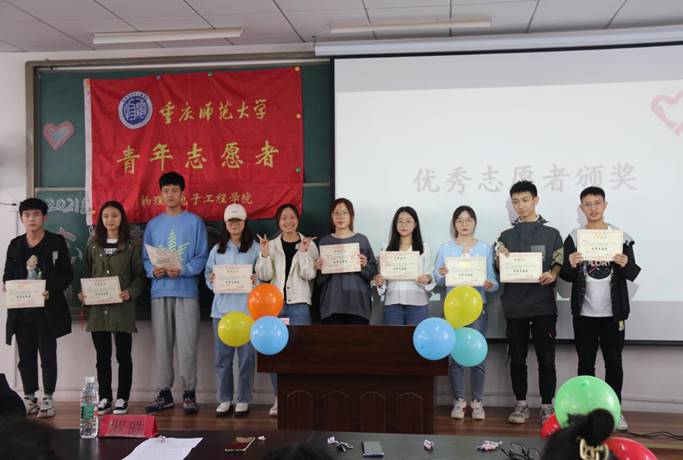 紧接着大会进行第三项议程:为“优秀志愿者”颁奖。因在上学年作出卓越贡献,树立了良好的志愿者形象,志愿者欧闲乐、赵盼、樊婷婷、刘芡君、李桂香、韩珂、袁青松、旷心怡、曾鹏、陈德璇荣获“优秀志愿者”奖项。获奖优秀志愿者合影留恋,全场响起热烈掌声,向所有获奖者表示衷心的祝贺。