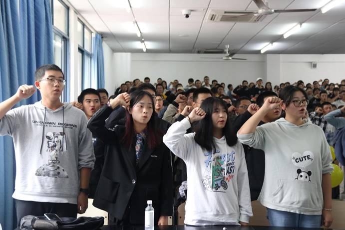 而后大会进行第四项议程:新生志愿者在志愿者旗帜下宣誓。由学生代表向科宇带领大家进行宣誓,全体成员举起右手,宣誓词铿锵有力,展现了新生志愿者的澎湃激情和参与志愿活动的坚定决心。