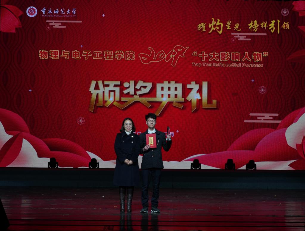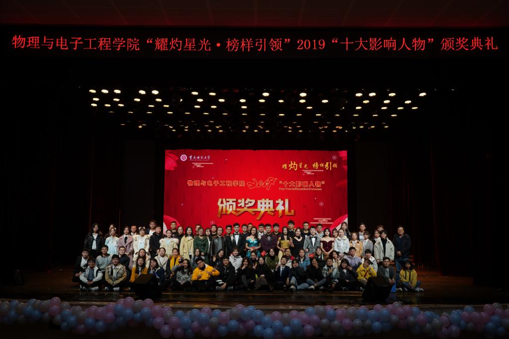 2019“十大影响人物”个人介绍片,了解了2019“十大影响人物”获奖同学在学业、科研、创新、创业、文体等方面追求卓越、逐梦前行的奋斗历程,听取了他们对物电学子的温暖寄语。随后,学校职能部门领导、学院领导及专业老师分别向2019“十大影响人物”获奖同学致颁奖词并向他们颁发奖杯及证书。