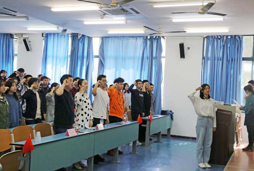 随后,仪式进行第二项,全体成员起立,一同合唱共青团团歌。同学们激情饱满,声音洪亮,展现出了新一代青年朝气蓬勃的面貌。