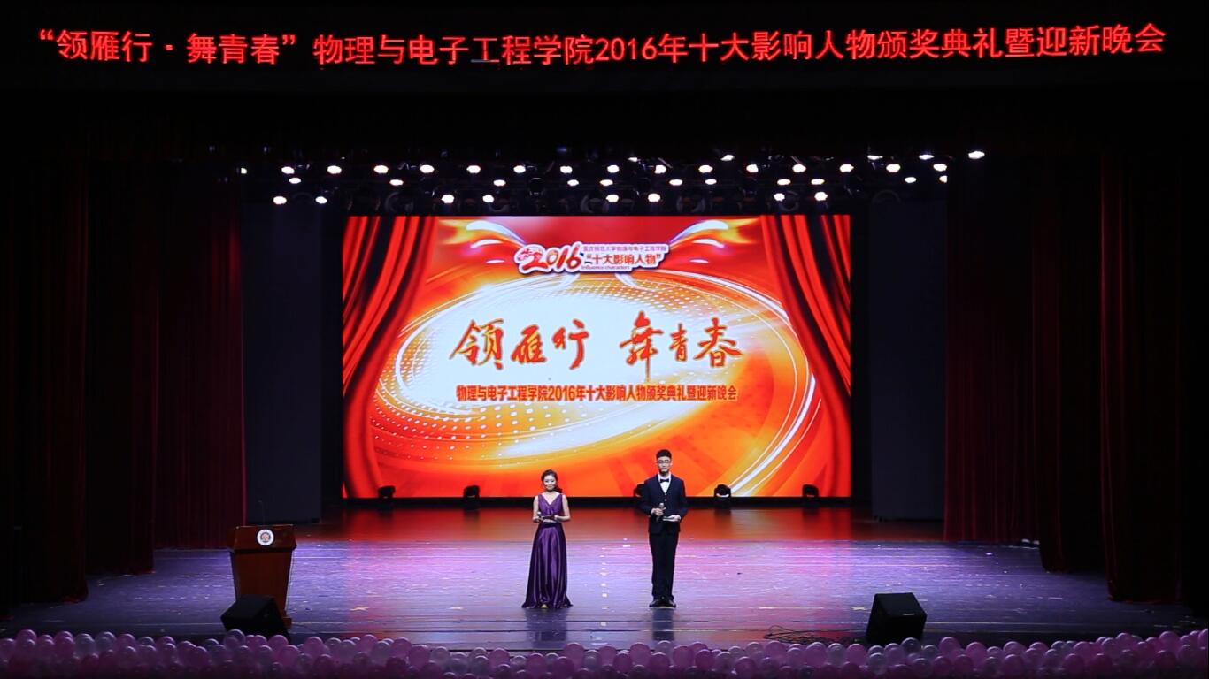 坚持“引领学生、服务学生、成就学生”的工作理念,组织开展了以“领雁行·舞青春”为主题的2016年十大影响人物的颁奖典礼。颁奖典礼于2016年12月25日18:30分在校友会堂隆重举行。学校党委副书记龚燕、党委组织部部长毛宇、党委宣传部部长陈洪、党委学工部部长张明志、招就处处长党亚莲出席本次活动,并为影响人物颁奖。