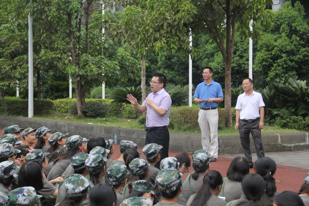 各连队指导老师及负责人在训练结束后,组织新生到篮球场整队集合。随后,冉久飞老师代表所有老师进行了发言。冉书记先表示了对新同学的欢迎,并强调选择报考学院与学院选择录取就是爱与被爱的关系,希望两者能够并存并且长存。在依次介绍了今天前来慰问的老师之后,冉书记畅谈了自己对大学的看法,“大学在每一个学生的印象中都不一样,有好有坏,就像现在的军训,充溢的是汗水的味道,但是每个人的人生又未尝不是?有曲折磨砺的人生,有跌宕起伏的人生,有顽强拼搏的人生,才不失为一个完整的人生。所以,珍惜大学时光,因为它能让你改变很多,同样,也珍惜军训时光,因为现在只是大学的第一课!”