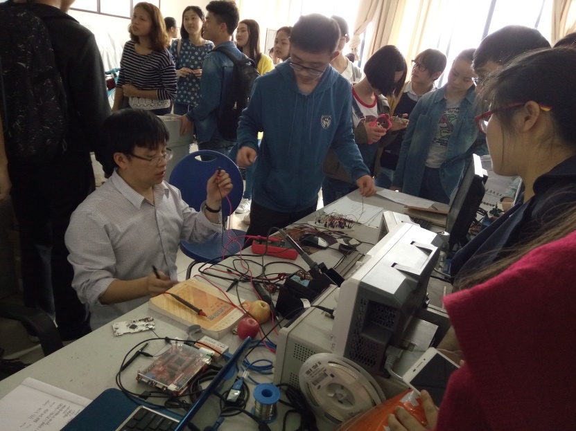 的科技精神,本次大赛既延续了赛事的举办,又达到了内容的创新。比赛内容包括了开关电源、抢答器、音频功率放大器、毫姆表以及光控实验室人数计数器的设计及成品展示。罗海军老师对参加制作音频功率放大器的小组作品进行了成品检验与评分,电压的调试,电路连接,功率测定,音效试听,每一项都作了仔细的评定,针对同学们的不足之处都给出了专业性指导,并对同学们的辛勤成果予以肯定。一个名为“新新之火”的作品因其性质优良而无出其右。在实验室的另一角,何传红老师则对光控方面的作品进行评分,对于光控感应器的计数器是否准确报数,何老师与选手沟通交流了其中的经验,并给出了相应的改进意见。而温开旭学长就对其他几项的参赛作品做出评判,反复的检验,细致的观察,最终给出评论。