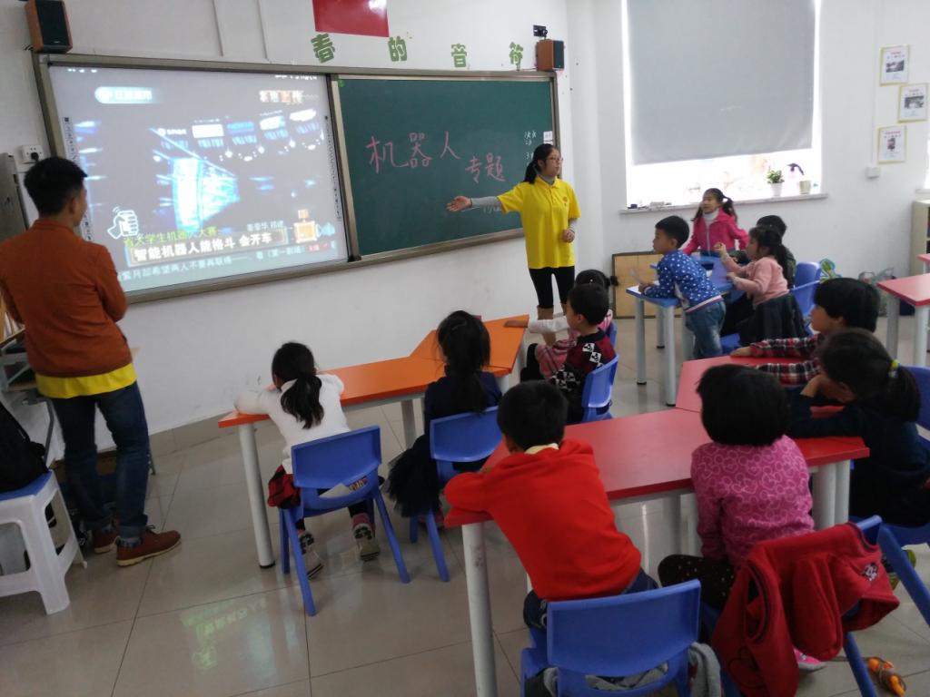 本次授课的内容是机器人专题。各位志愿者们精心准备了视频和PPT。首先电影超能陆战队的片段便引起了小学生们对机器人的兴趣,而后,通过志愿者的讲解,小学生们了解了到机器人悠久的历史,了解到我们现在机器人的发展情况,了解到现在世界的八大顶级机器人及机器人对我们人类的帮助。特别在讲到现在高科技的机器人时,小朋友们都被引起了极大地兴趣,大家争先恐后的谈论起自己了解的机器人,甚至有人将自己家能做清洁的机器人拿出来举了例子。志愿者说,现今我们身边已经投入机器人应用,带给了人们生活上极大便利。小朋友们对机器人兴致勃勃,对讲解内容也饶有兴趣。