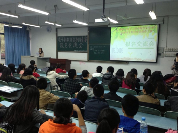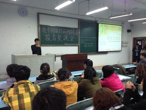 学生会科技部部长石可嘉做交流。她对今天嘉宾及所有同学的到场表示感谢,然后以一位曾经获奖的高年级同学的参赛经历为例指出参加电子科技作品制作竞赛是一个很好的学习机会,无论是在专业知识方面还是在社会活动时间方面,诸多能力都会得到提升,但是大家在比赛中要注意避免产生头重脚轻式的项目开发,即有能力的同学面面俱到,能力较差的同学无事可做。然后,科技部副部长向承琼介绍了电子科技作品制作竞赛的大体流程:初步组队报名、专业老师指导课题选择、作品模板成型、评审组的最终评定。据悉,比赛时间会持续到下学期截止,而参赛者在本学期的主要工作是完成课题的选定。最后,同学们开始进行现场自由交流、组队、提交报名表,现场一片火热。