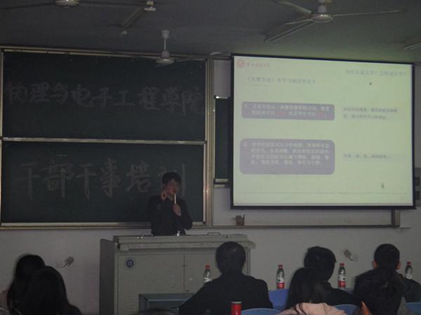 团总支·学生会于2012年11月15日下午在弘德楼15201教室进行了第三次干部及干事培训。此次培训的主题为《学生干部的成才及人文素养》,主讲人是来自重庆师范大学涉外商贸学院的党工委副书记何东教授。参加此次培训的有2011和2012级的学生会成员,以及2010-2012级各班的班长和团支书。