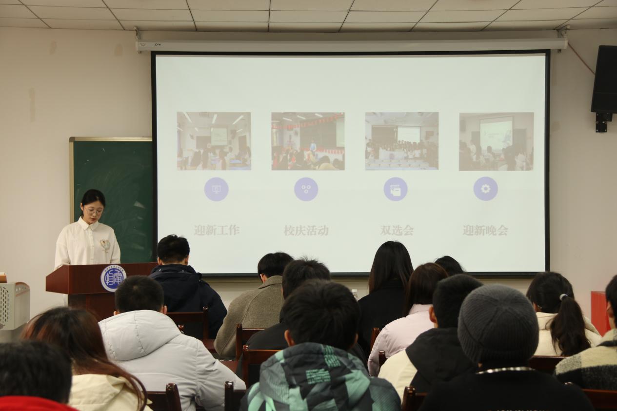 首先,主席团成员针对本学期学院迎新、院学生会招新、学校70周年校庆、双选会以及院迎新晚会等各项工作进行详细汇报,对本学期工作进行了归纳总结。