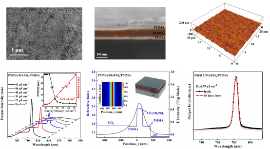 在日益增长的短距离数据通信领域,卤化铅钙钛矿是新型放大器和激光器的理想光源。然而,钙钛矿型光电子器件存在的大量缺陷以及稳定性严重限制了其进一步的产业化应用。针对这一研究难题,本研究提出了三条策略共同作用实现高稳定性和光放大增强的MAPbI3钙钛矿薄膜的制备:1)用离子液体醋酸甲基铵(MAAc)制备MAPbI3薄膜,以降低薄膜缺陷提高薄膜质量;2) 使用聚甲基丙烯酸甲酯(PMMA)钝化层来提高MAPbI3薄膜的光学和热稳定性;3) 设计了对称波导(SWG)结构以增强MAPbI3薄膜的光放大特性。与传统的MAPbI3薄膜相比,SWG结构通过模式限制和传播损耗的降低,使MAPbI3薄膜实现更低的ASE阈值、更高的光学增益和改进的光稳定性、热稳定性和湿度稳定性。文中利用飞秒瞬态吸收光谱和电场分布计算,阐明了载流子动力学和载流子声子效应以及观察到的功能化效应的微观机制。该项研究为实现高效ASE和激光发射提供了简单有效的方法。