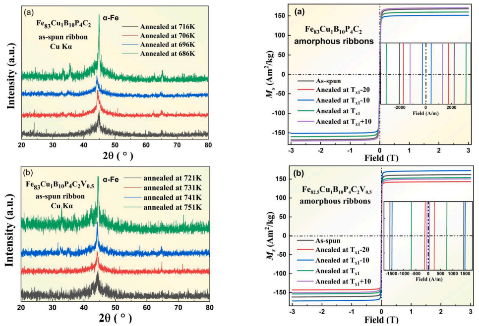 近日,非晶态物理与先进金属材料课题组,本科生吴欣茹(第一作者)在唐本镇博士和余鹏教授的指导下,以重庆师范大学为第一单位在《Journal of Non-Crystalline Solids》(JCR一区,非晶态物理和非晶材料经典老牌期刊)上发表题为“Modulation of soft magnetic properties of Fe83B10P4C2Cu1amorphous alloys by V addition and annealing treatment”的学术论文。