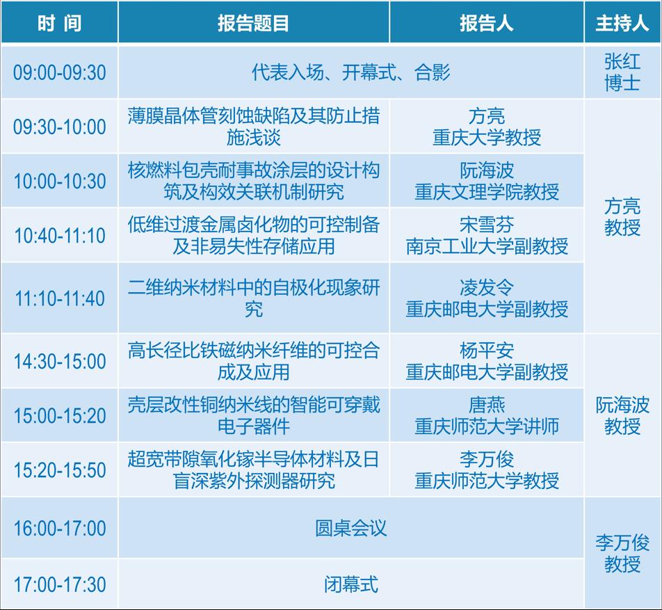 重庆大学方亮教授在报告中介绍了TFT叠层电极刻蚀缺陷的研究现状,并讨论其防止措施及相关科学问题;重庆文理学院阮海波教授以“核燃料包壳耐事故涂层问题的提出及研究现状”为题做专题报告,介绍其课题组在核燃料包壳耐事故涂层方面最新研究进展;南京工业大学的宋雪芬副教授介绍了低维过渡金属卤化物的可控制备及非易失性存储应用并分享其课题组在二维过渡金属卤化物及其在非易失性存储中的工作进展;重庆邮电大学凌发令副教授对二维纳米材料中的自极化现象对材料的电子结构、输运、表面活性等性质的影响做专题报告;重庆邮电大学杨平安副教授介绍了磁场辅助原位还原合成高长径比铁纳米线及包覆、轻质宽频带吸波涂层设计和柔性触觉传感器设计及应用;重庆师范大学斗牛扑克