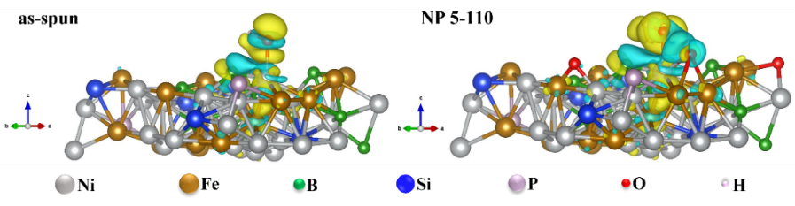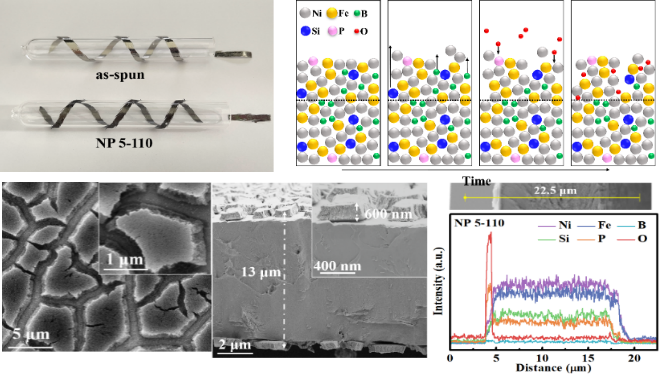 本研究主要聚焦设计高性能、可自支撑的一体化析氧催化剂应用于电解水制氢技术。非晶合金具有长程无序、不饱和位点丰富和力学性能优异等特性,有望成为优异的结构-功能一体化的催化材料。本研究成功研发了带有表面氧化层的Ni-Fe-B-Si-P非晶块体催化剂。其表面的非金属含氧阴离子层,优化了非晶块体的表面性质和局部化学环境,缩短了在催化表面重构中Ni0 → Ni2+ → Ni3+ → Ni4+的多步演化路径,降低了Ni-Fe-B-Si-P的催化能垒。相比无氧化层的Ni-Fe-B-Si-P,其电流密度增加了56倍,转移频率值增加了8倍。该研究实现了低成本非晶态块体催化剂的研制,初步揭示了关于非晶块体的表面催化层的调控机制和催化性能增强机理。这项工作为非晶块体催化剂的合理设计和实际应用提供了有价值的路径。