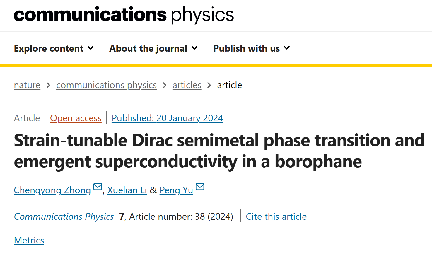 为唯一单位在Nature旗下期刊《Communications Physics》(中科院物理大类一区TOP期刊)上发表题为“Strain-tunable Dirac semimetal phase transition and emergent superconductivity in a borophane”的最新研究成果。