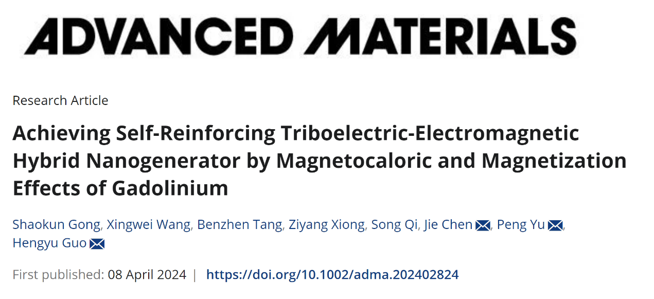 凝聚态物质科学创新团队以“Achieving Self-Reinforcing Triboelectric-Electromagnetic Hybrid Nanogenerator by Magnetocaloric and Magnetization Effects of Gadolinium”为题在国际顶级期刊《Advanced Materials》(影响因子29.4)上发表最新研究成果,重庆师范大学为第一署名单位,本科生龚少坤与唐本镇博士为共同第一作者,陈杰副教授和余鹏教授为共同通讯作者,清华大学和重庆大学为合作单位。