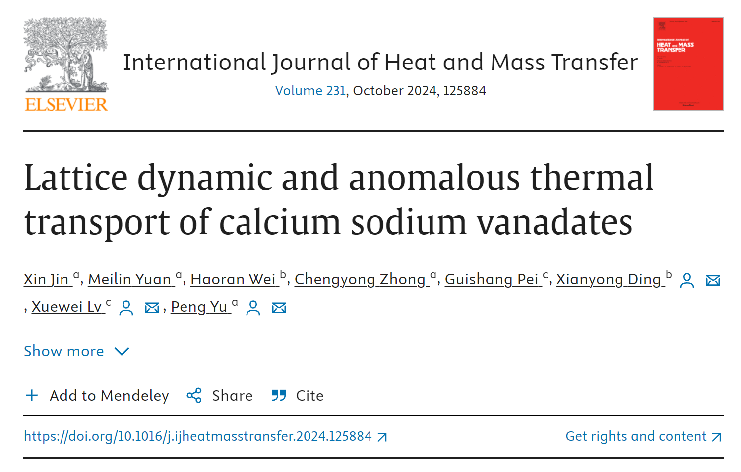 先进金属材料与非晶态物理团队在爱斯维尔旗下的传热领域顶刊、中科院热力学小类一区Top期刊《International Journal of Heat and Mass Transfer》发表题为“Lattice dynamic and anomalous thermal transport of calcium sodium vanadates”的高水平研究论文,论文以重庆师范大学为第一单位,学院青年教师靳鑫博士为第一作者,余鹏教授为通讯作者,重庆大学吕学伟教授为共同通讯作者。