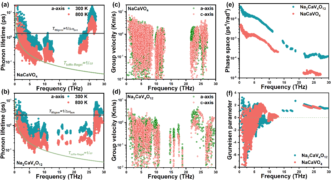 在这项研究工作中,对钙钠钒酸盐包括NaCaVO4和Na2CaV4O12的晶格动力学、热力学和热输运性质进行了全面的理论研究。首先利用准简谐近似方法,计算了包括热容、热膨胀系数和吉布斯自由能在内的宽温度范围内的热力学性质,与现有实验数据吻合较好。其次,结合玻尔兹曼输运方程和热输运统一理论,揭示了NaCaVO4和Na2CaV4O12的分层热传输行为,扩散声子通道对晶格热导率(κL)具有较大贡献。这导致κL的温度依赖性较弱,偏离了典型的κL~T-1趋势。考虑了传播声子和波动相干声子的贡献,预测NaCaVO4和Na2CaV4O12在室温下的平均κL值分别为2.43和1.25 W/mK,通过详细的电子结构和声子输运性质分析,揭示了分级热传输行为的起源主要归因于较强的非谐性和低的声子群速度,这与弱Na-O (Ca-O)键和强V-O键的键合异质性密切相关。该项研究不仅增强了钙钠钒酸盐的各种实际应用,还为离子插层钒基氧化物的基本热物理性质提供了新的见解。