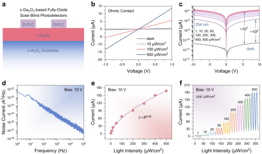 氧化锌(ZnO),凭借其卓越的性能、环境友好及成本效益等,已成为透明导电氧化物领域的优选材料之一。本研究聚焦于掺碳技术,旨在探索其在提升ZnO薄膜光电性能方面的潜力。实验结果显示,碳掺杂ZnO(ZnO:C)薄膜在保持高质量表面形态的同时,其在可见光范围内还具有超高透过率,光学带隙表现出典型的Burstein–Moss效应。进一步分析表明,随着碳掺杂量的优化,ZnO:C薄膜展现出了高载流子浓度(~3.73×1019 cm-3)、低电阻率(~3.69×10-3 Ω·cm)以及保持高迁移率(~46.08 cm2/V·s)。基于此,团队将新型ZnO:C透明导电薄膜应用于Ga2O3基日盲深紫外光电探测器中,作为透明电极材料,成功实现了透明光电探测器件的构造,并表现出卓越的日盲深紫外光电探测能力。这一成果不仅为透明导电材料的研发开辟了新的路径,ZnO:C也有望成为传统IIIA掺杂ZnO透明导电材料在光电器件领域的有力竞争对手,展现出广阔的应用前景。