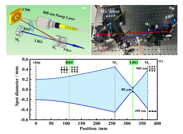 该项研究成果报道了一种发射波长为 490 nm的高功率宽调谐倍频半导体碟片激光器。即通过优化增益芯片结构,在中心波长 980 nm 处获得宽的增益谱,同时还采用反谐振微腔结构,从而扩大了波长的调谐范围,当使用1 mm厚的双折射滤光片,980 nm的基频光调谐范围为50.7 nm。为了获得高功率蓝光输出,采用V型谐振腔结合5 mm长的I类相位匹配LBO晶体,最终在490 nm波段实现了5.36 W 的最大输出功率,吸收泵浦功率到蓝光的光-光转换效率为 15.3%。同时,倍频蓝光激光器的调谐范围达到了创纪录的 21.5 nm,并且保持高的光束质量。