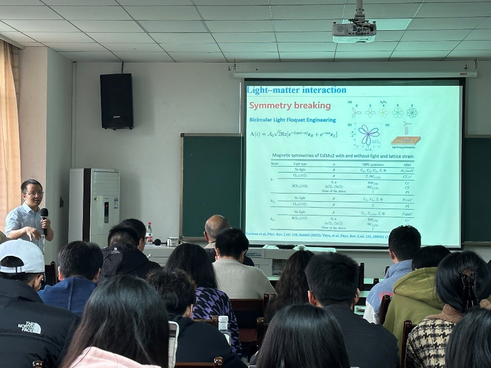 王锐教授在报告中结合低能有效模型、弗洛凯理论和对称性分析等方法,总结了不同形式的周期驱动光场(例如线偏振光、圆偏振光、双频光等)所诱导的对称性破缺,揭示光场下拓扑物态的对称性保护机制。例如,在过渡金属硫化物双层异质结WS2/WTe2中实现了光诱导自旋谷过滤器;二维材料MSi2Z4(M = Mo,W, V; Z = N, P, As)家族可实现光场精确操控的高陈数量子反常霍尔器件;周期光场驱动仅受粒子空穴对称保护的四极矩拓扑绝缘态以及光控外尔半金属的相关研究等。与会师生被报告内容深深吸引,并积极提问,王锐教授耐心解答并和大家一起探讨科研创新工作方法,交流现场学术氛围浓郁。