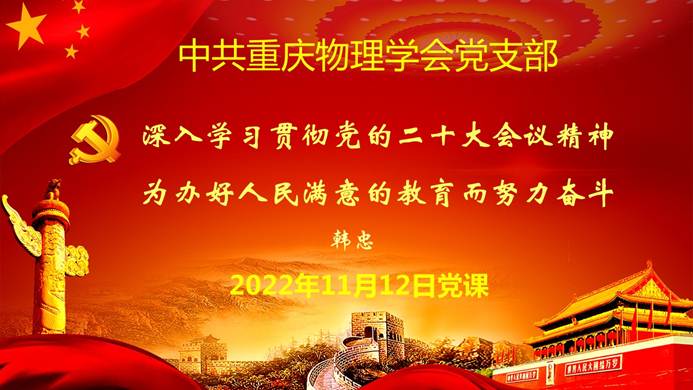2022年11月12日,重庆物理学会召开了线上常务理事会。会议上学会党支部组织了“学习贯彻党的二十大精神专题党课”,党课由学会党支部书记杨晓红教授主持,学会副理事长、重庆大学物理学院党委书记韩忠教授主讲。党课的主题是:深入学习贯彻党的二十大精神,为 “办好人民满意的教育”而努力奋斗。