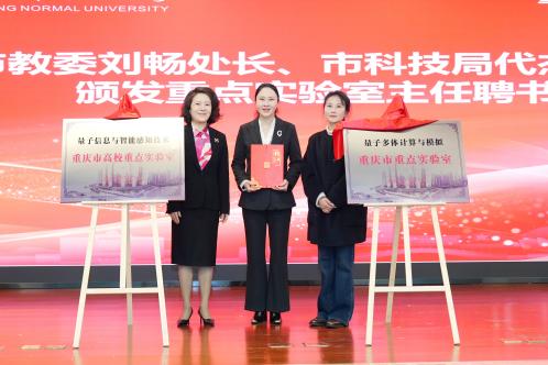 揭牌启动仪式上,在市教委刘畅处长和市科技局代杰主任的共同见证下,重庆师范大学党委副书记、校长王国胤分别为两个重点实验室揭牌。随后,刘畅处长和代杰主任为我校发展规划处处长张丁可教授颁发重点实验室主任聘书。两大重点实验室的落地,不仅标志着我校量子科技领域科研平台建设迈上新台阶,更将为区域量子学科发展、高层次人才培养与关键技术创新筑牢坚实支撑,为产学研用深度融合搭建重要桥梁,助力重庆量子产业高质量发展。