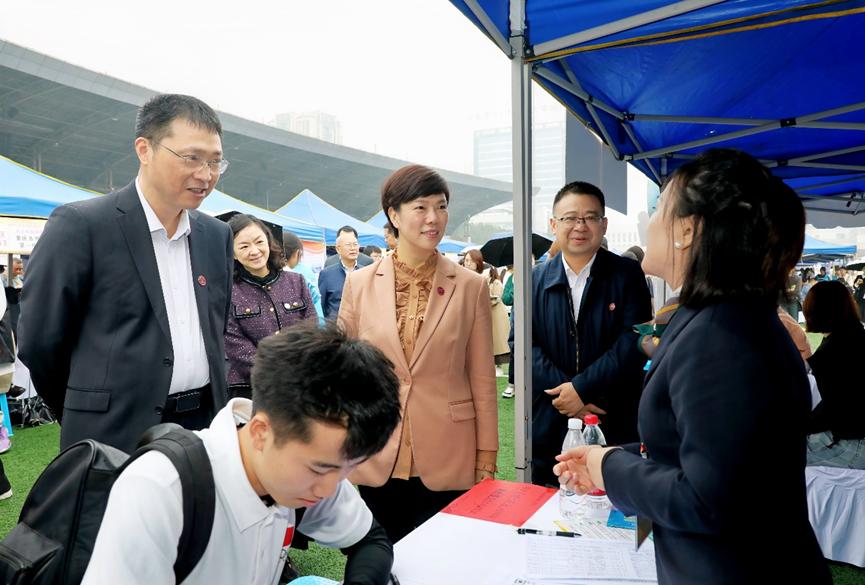 双选会期间,学校党委书记张艳,党委副书记、校长王国胤等在家校领导亲临双选会现场指导工作,向用人单位介绍了学校的人才培养举措和教育教学成果,并了解了各行业发展趋势与招聘要求,听取用人单位对我校人才培养工作的建议,并对用人单位表达了衷心的感谢;鼓励毕业生要珍惜机会,勇于尝试,努力提高核心竞争力,同时要保持乐观,不断学习,积极就业,大胆创业,争取尽早就业。