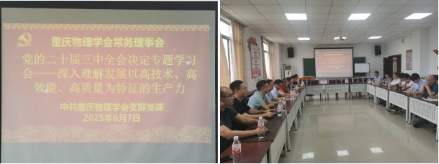 为推动学会高质量发展,学会党支部组织常务理事会以深入理解发展以高技术、高效能、高质量为特征的生产力为主题的党的二十届三中全会决定专题学习会,进一步深入认识广大科技工作者为现代化新重庆建设作贡献的着力方向。